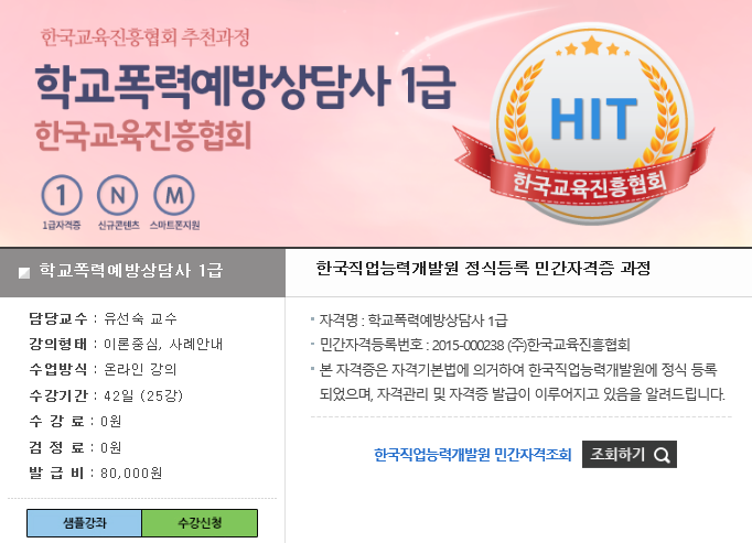 우리 교육원 학교폭력예방상담사과정 은 학교폭력예방상담사1급자격증 으로 학교폭력예방상담사2급 등 하위 자격증이 없어도 취득을 할 수 있고 이력서에도 학교폭력예방상담사자격증 을 기재할 수 있습니다.